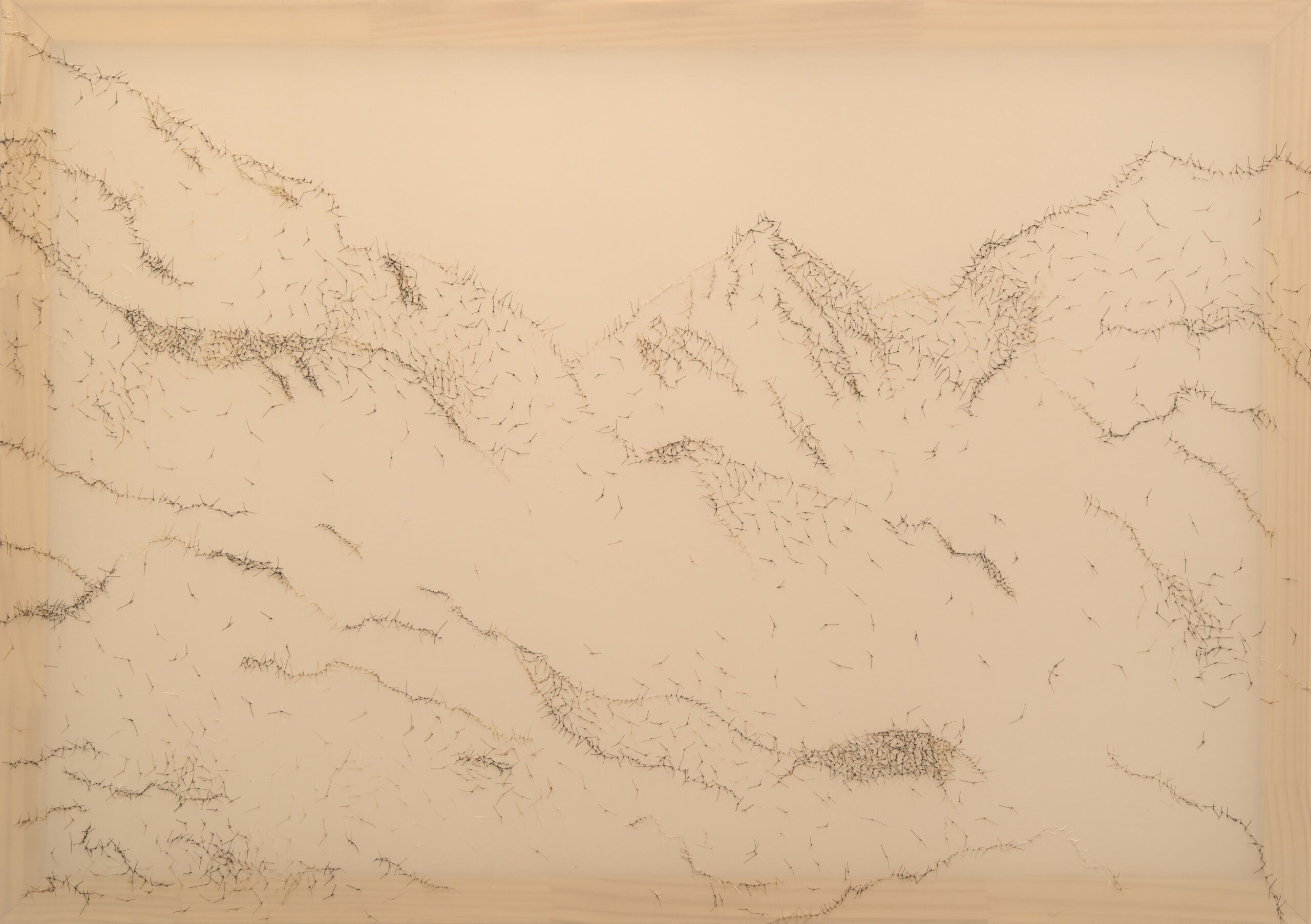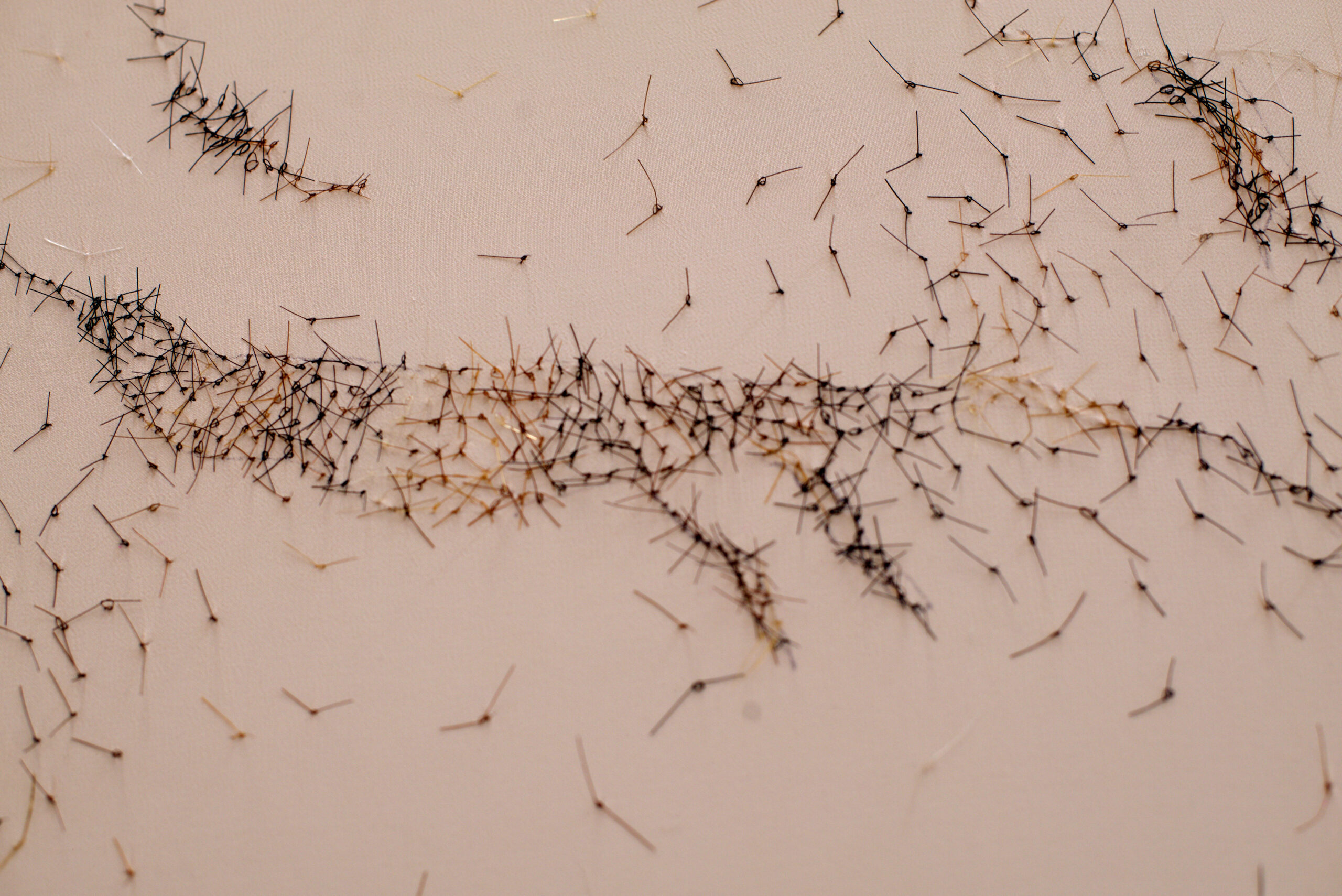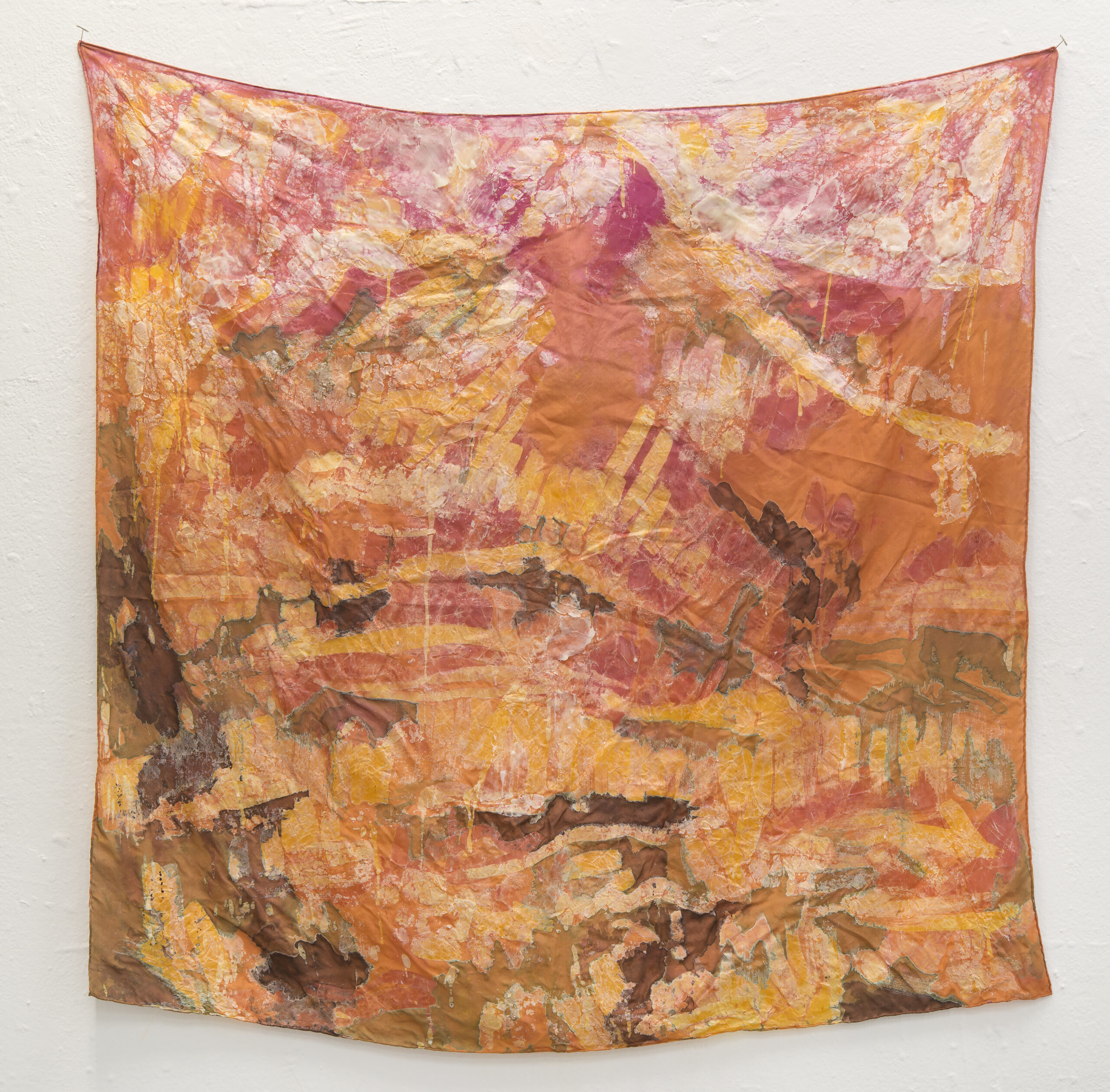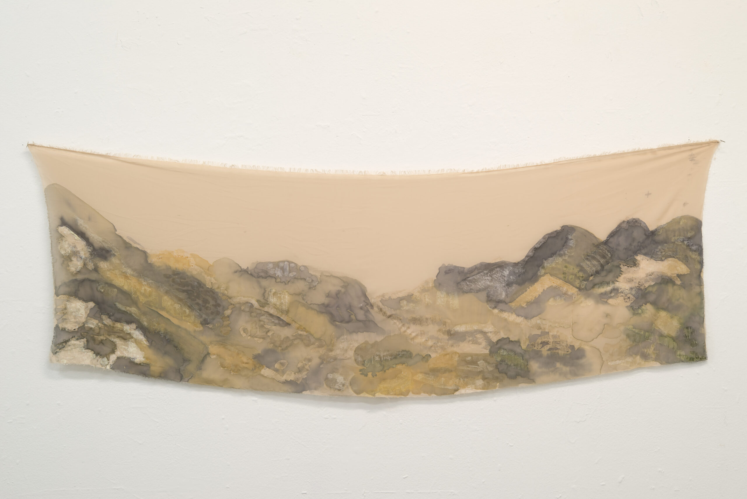 “The waterfall that once poured into a clear pond at my favorite hiking spot doesn’t even trickle anymore. This waterless waterfall is horrifying, but also strangely beautiful. The sun still hits the peek and glimmers off the sedimentary boulders bouncing from top to top until it reaches the now small mud puddle at its basin. These striking scenes are the catalyst to my current body of work. My wish is to present an exhibition that speaks to both the vast picturesque landscapes we see on postcards and the beauty I find in the decomposing vistas. I am investigating such imagery through silk painting, wax and stitching. In its deteriorated state the wax speaks to the landscapes’ decay and destruction. The layers of the work – dye, then wax, followed by dye, then stitching – allude to a landscape that was formed, then altered, then formed again just like the many landscapes that surrounded me as a child. I use horse hair in my work to stitch pieces of the landscape together or to mend it. The continuous repetitive step of piercing and tying each hair on the surface forming a mountain feels cathartic. Making almost surgical-like stitches somehow works through the feelings I have about the destruction of the landscape. Through the ripping and tearing apart and then mending and repairing, I feel I express my distress about what we are doing to nature. Behind this exhibition will be several dualities: permanence and impermanence, the beauty of a pristine landscape and the beauty in its decay, my condemnation of the devastation of nature and my appreciation of the beauty that can result. The work is not political, seeking to call attention to the devastating results of environmental unconsciousness rather, it investigates my conflicting emotional response to landscape, now so often ruined by humans, a conflict that I see as fertile ground for art making.”