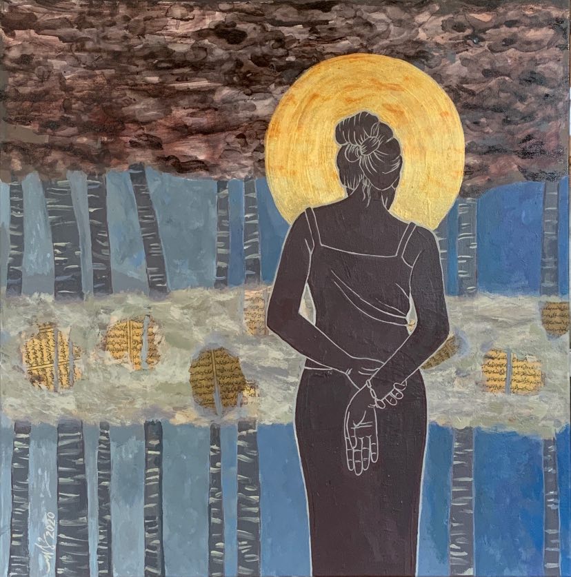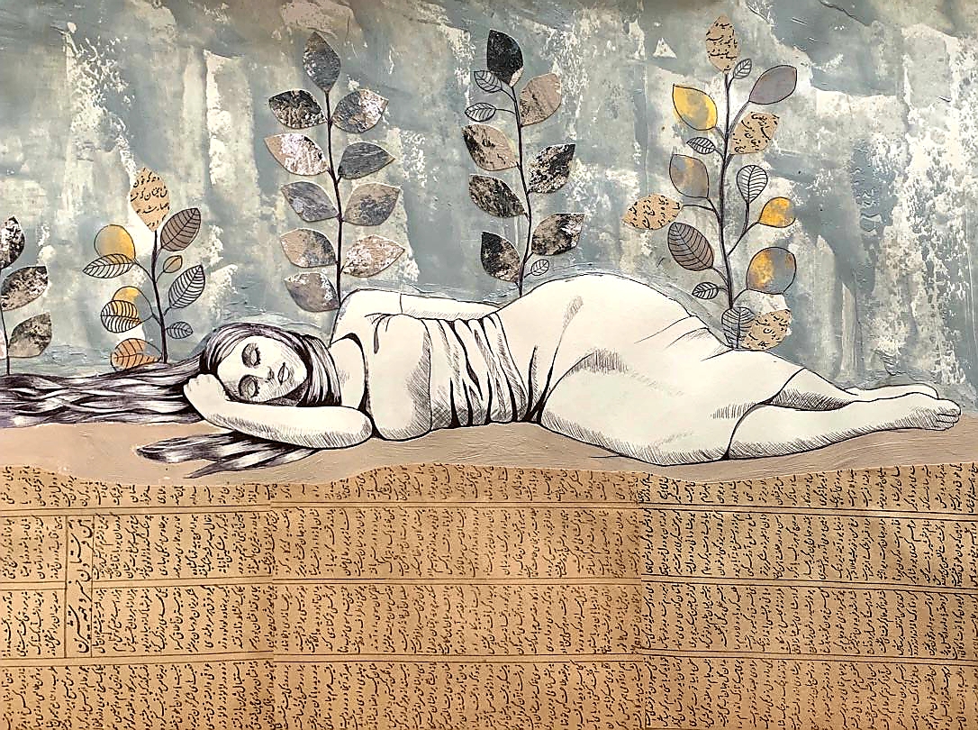 The female figures are painted looking away, with their backs to the viewer, immersed in thought. The poetry written out, surrounding them, comes from Nezami Ganjavi, the Iranian poet (13th century). The poems are on love, and peace.